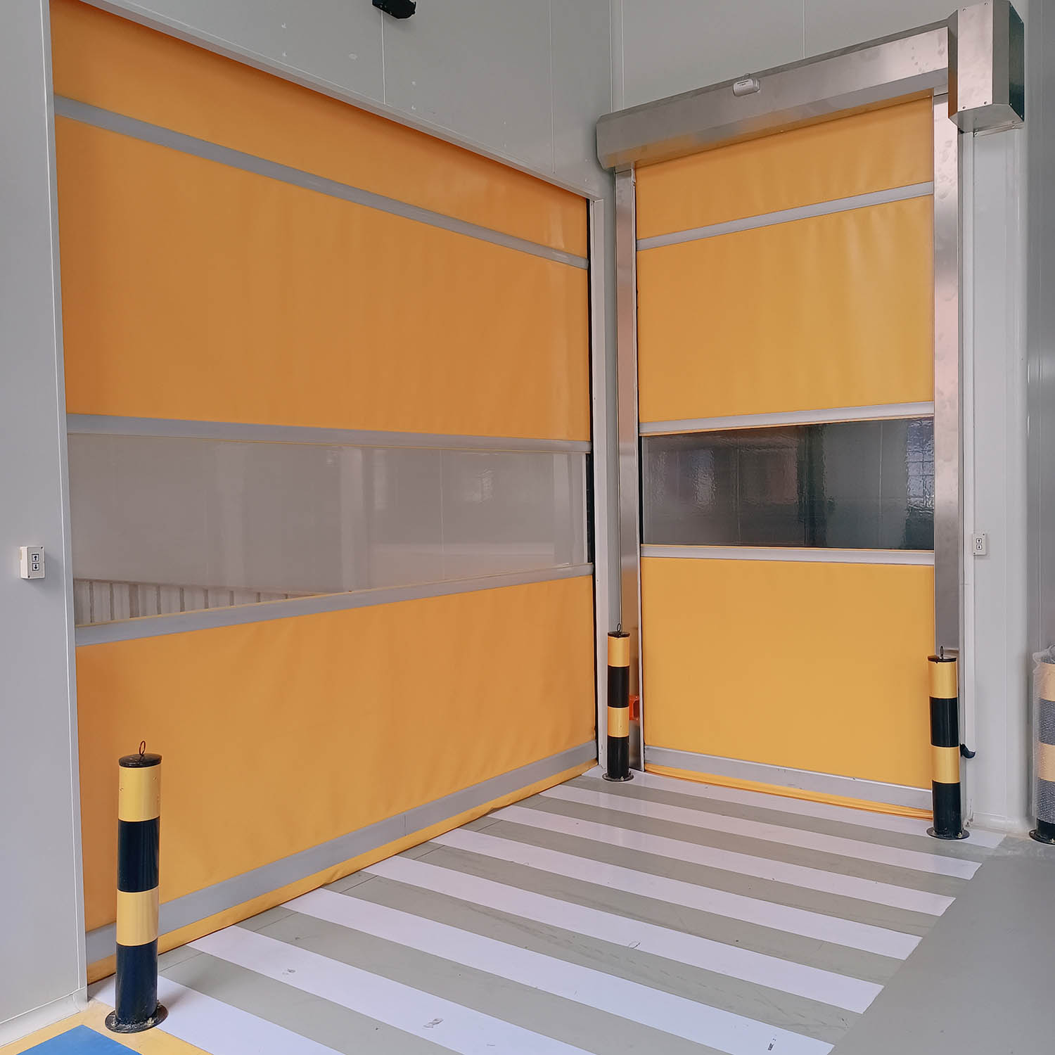 快速卷簾門設有控制箱,可在控制箱操作“開”、“停”、“關”,并可在控制箱的另一側墻面設控制按鈕操作“開”、“停”、“關”。快速卷簾門可根據需要選配遙控操作和雷達探測或地磁感應自動開關門,在門洞二側設有紅外線監測裝置,當門體運動時有障礙物穿越門洞時,簾布運動將停止,或回復到開門狀態。