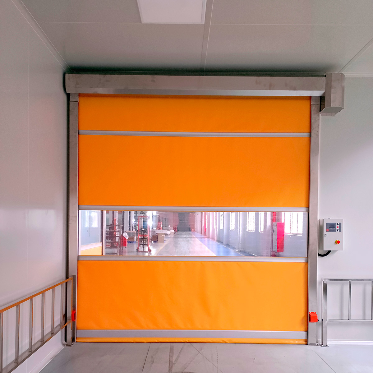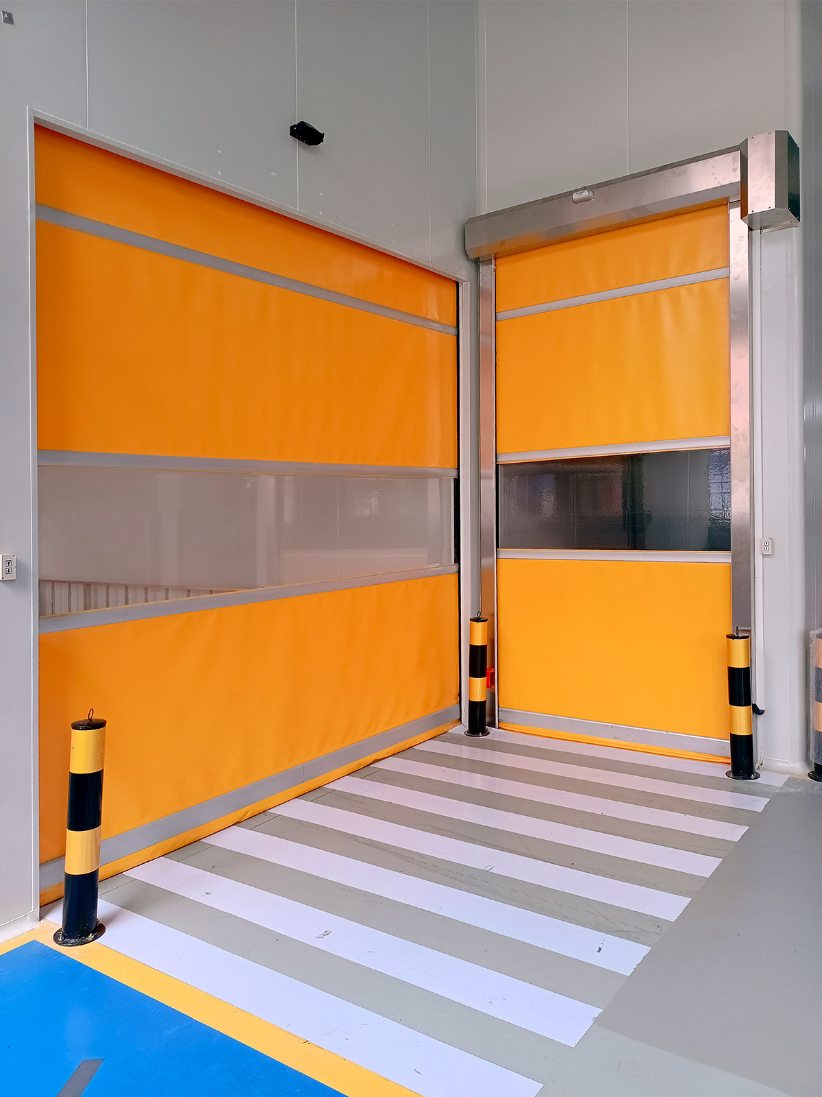選用法國進口高強度工業織布,厚度為0.9mm,顏色:紅色、黃色、藍色、綠色、橘黃色、灰色、白色、黃色網格、白色網格等多種顏色可選擇,中間加裝透明視窗(厚1.2mm)使人員車輛出入更安全,具有高抗拉強度, 高抗穿刺性能,適用于頻繁開啟,高速運轉;外置鋁合金肋條,增加抗風效果。